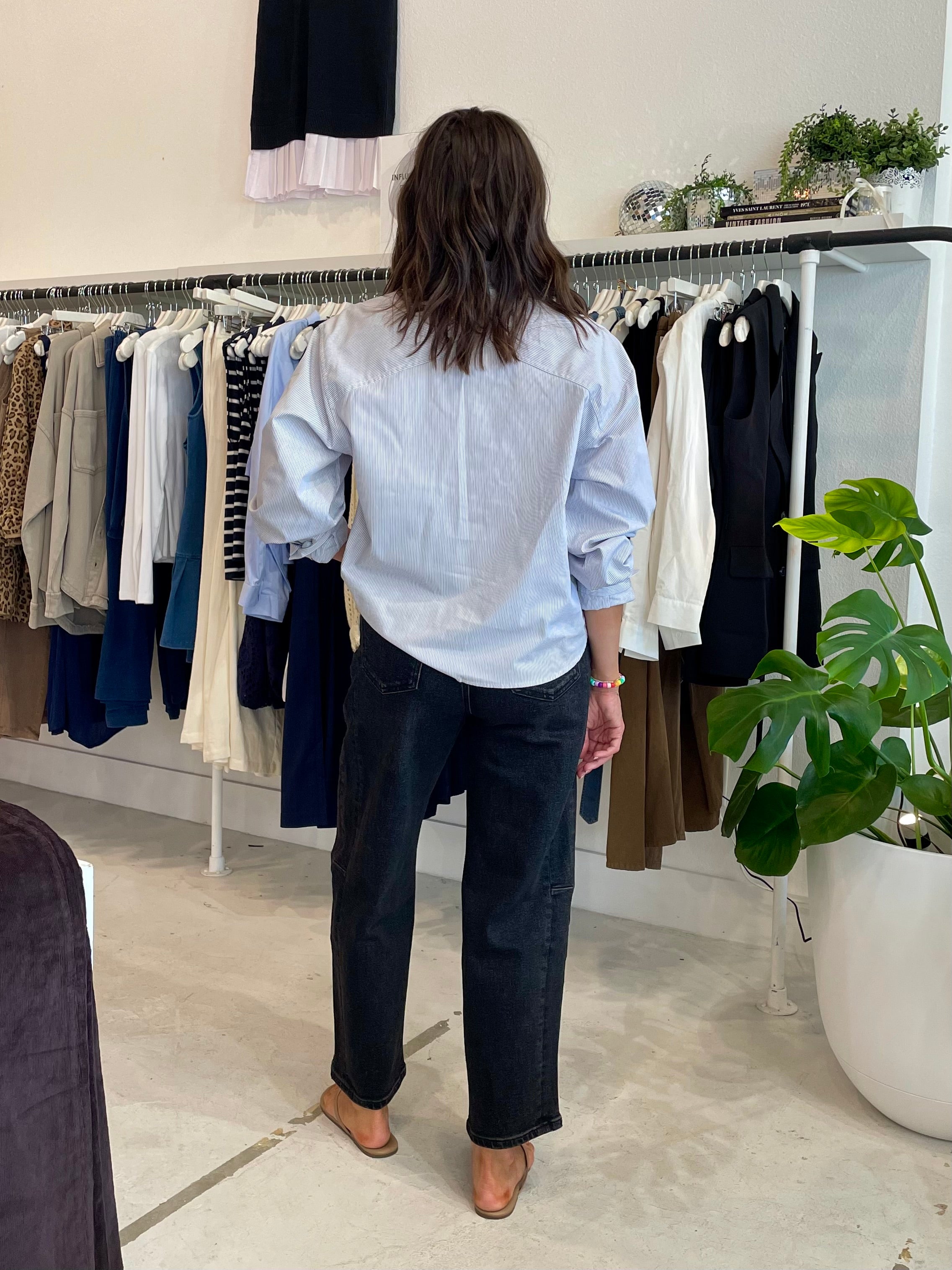 Stylist Tip: A modern take on the classic button-up. Finn is a fitted with a slightly rounded shirt-tail hem shape. This shirt features clean tailoring, featuring a classic button up fit. A classic reimagined. Designed in our timeless cotton yarn-dyed titanium striped poplin, the back yoke feature a unique criss-cross detail—an unexpected twist that sets Finn apart. Finn is slightly cropped and may show some midriff on some.