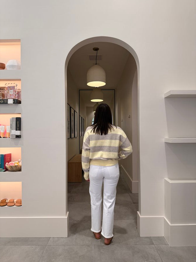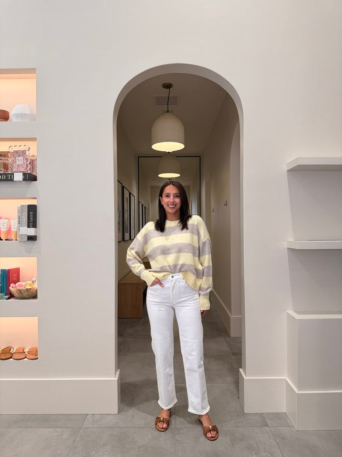 Stylist Tip: This cotton blend sweater is an instant favorite with its two-tone stripe, relaxed fit, and midweight feel. Throw over your favorite tee and go to jeans for an effortless look!