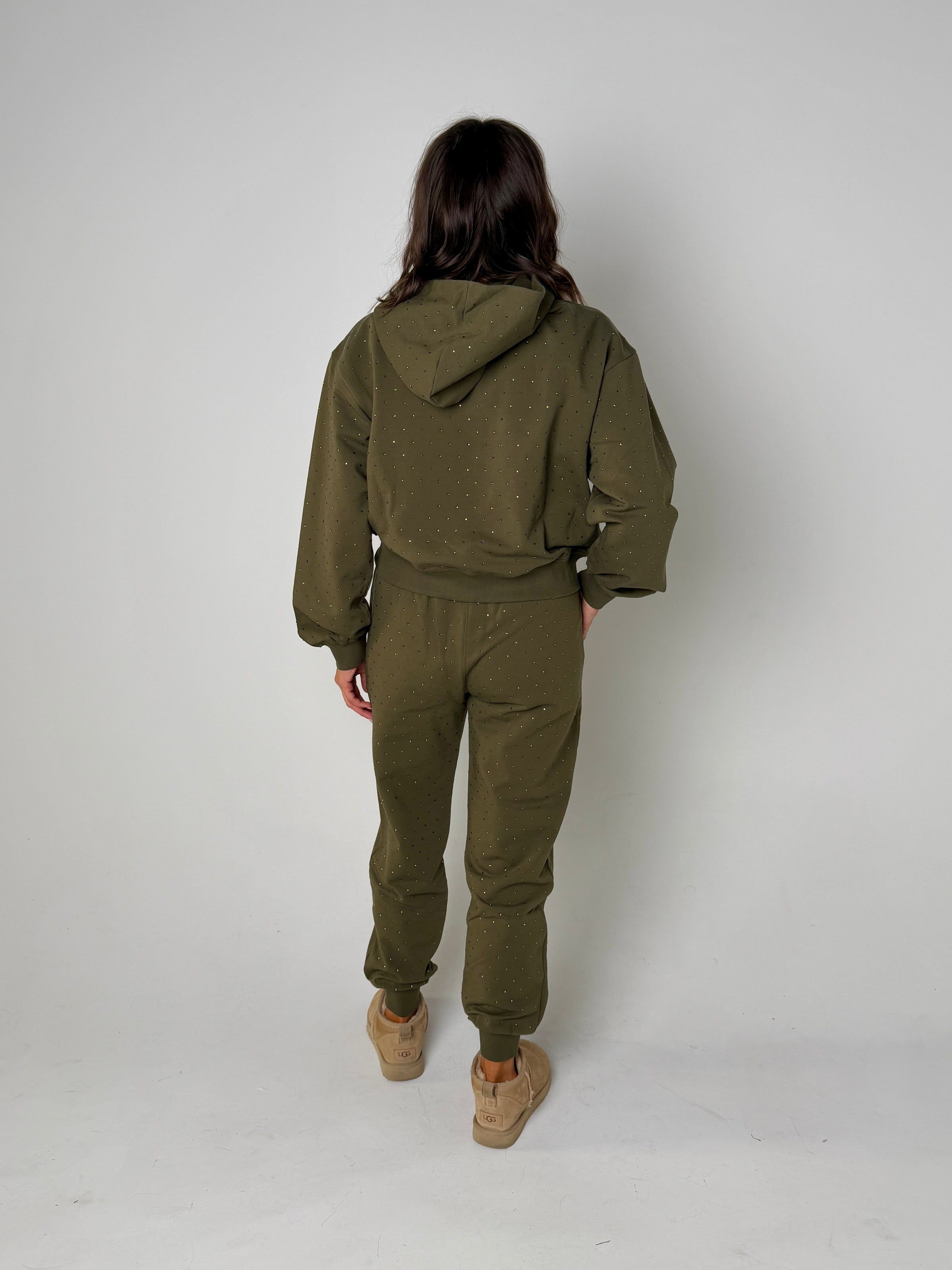Stylist Tip: Upgrade your sweatpants game with our Ruel Crystal Sweatpants. Made with luxurious olive-colored fabric and adorned with sparkling crystals, these sweatpants combine style and comfort for an elevated look. Perfect for lounging or running errands, you'll feel confident and chic in these trendy sweatpants.