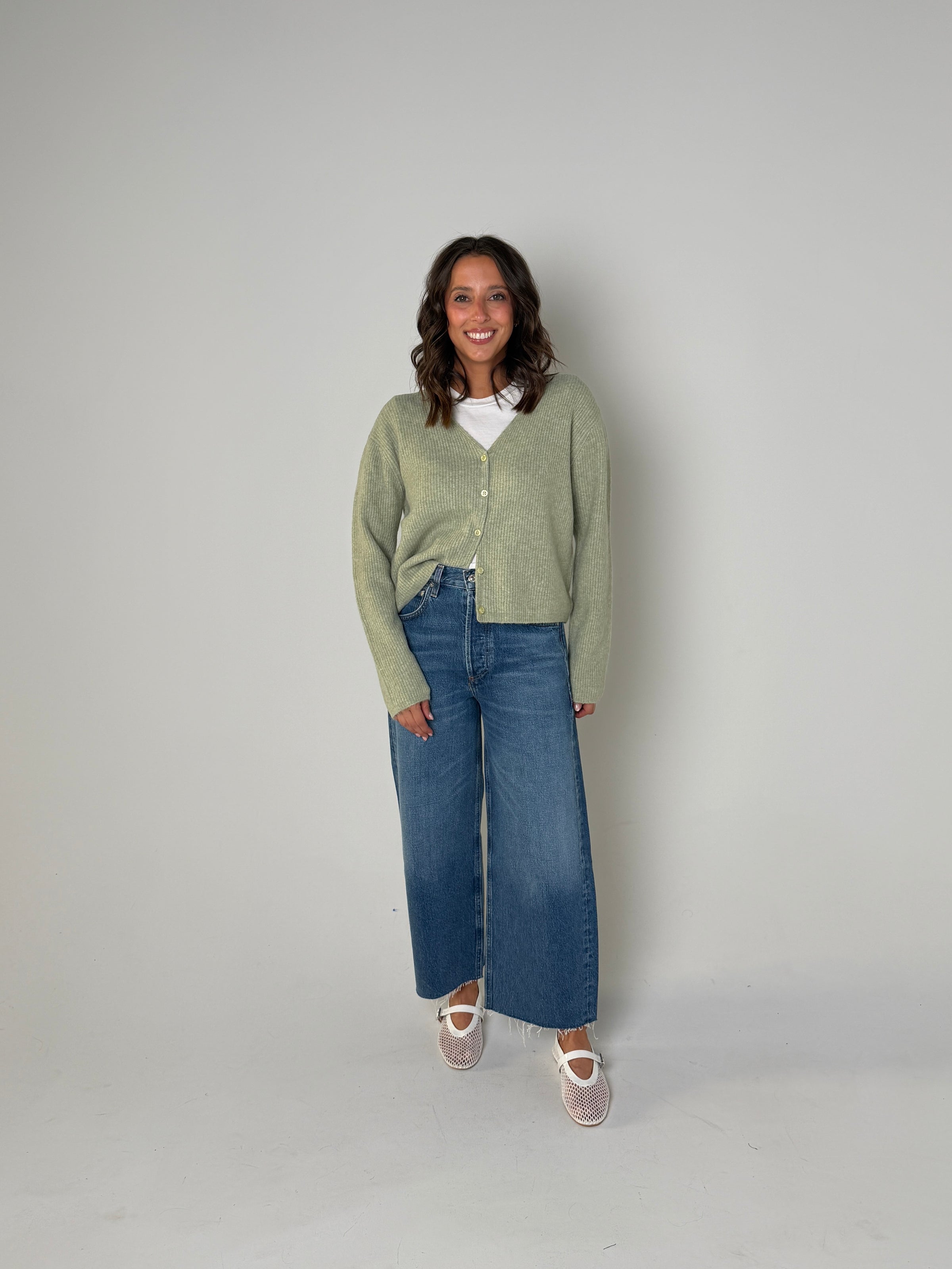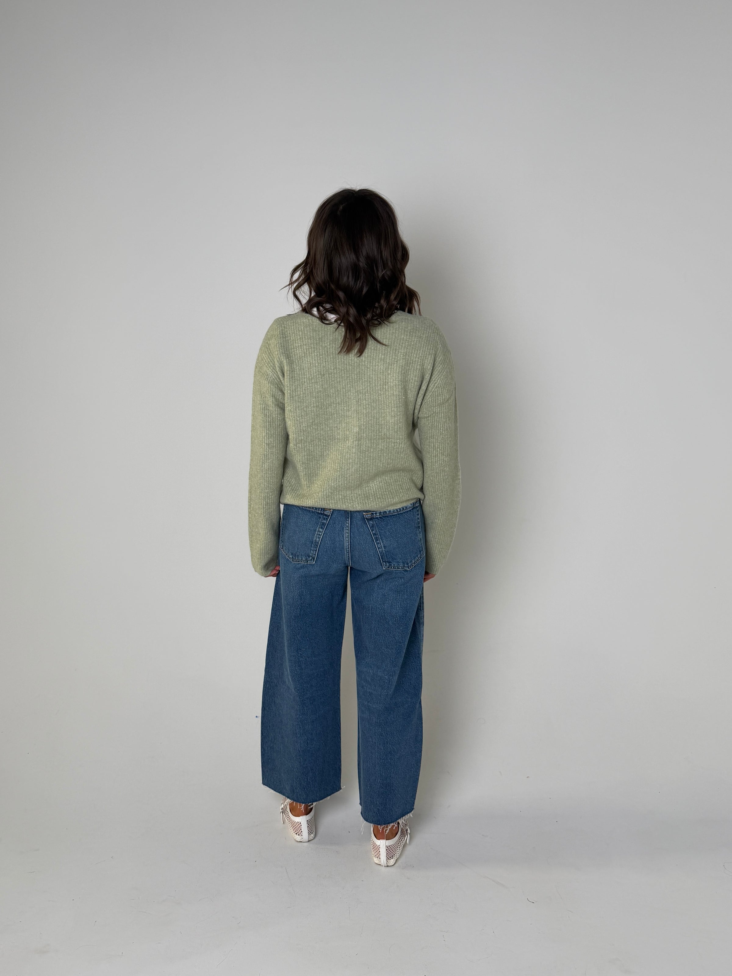 Stylist Tip: Upgrade your wardrobe with the Emile Cardigan. This V-neck, bay leaf colored cardigan is both stylish and versatile. Crafted with comfort and quality in mind, it's the perfect addition to any outfit. Elevate your look with this must-have piece for any season.