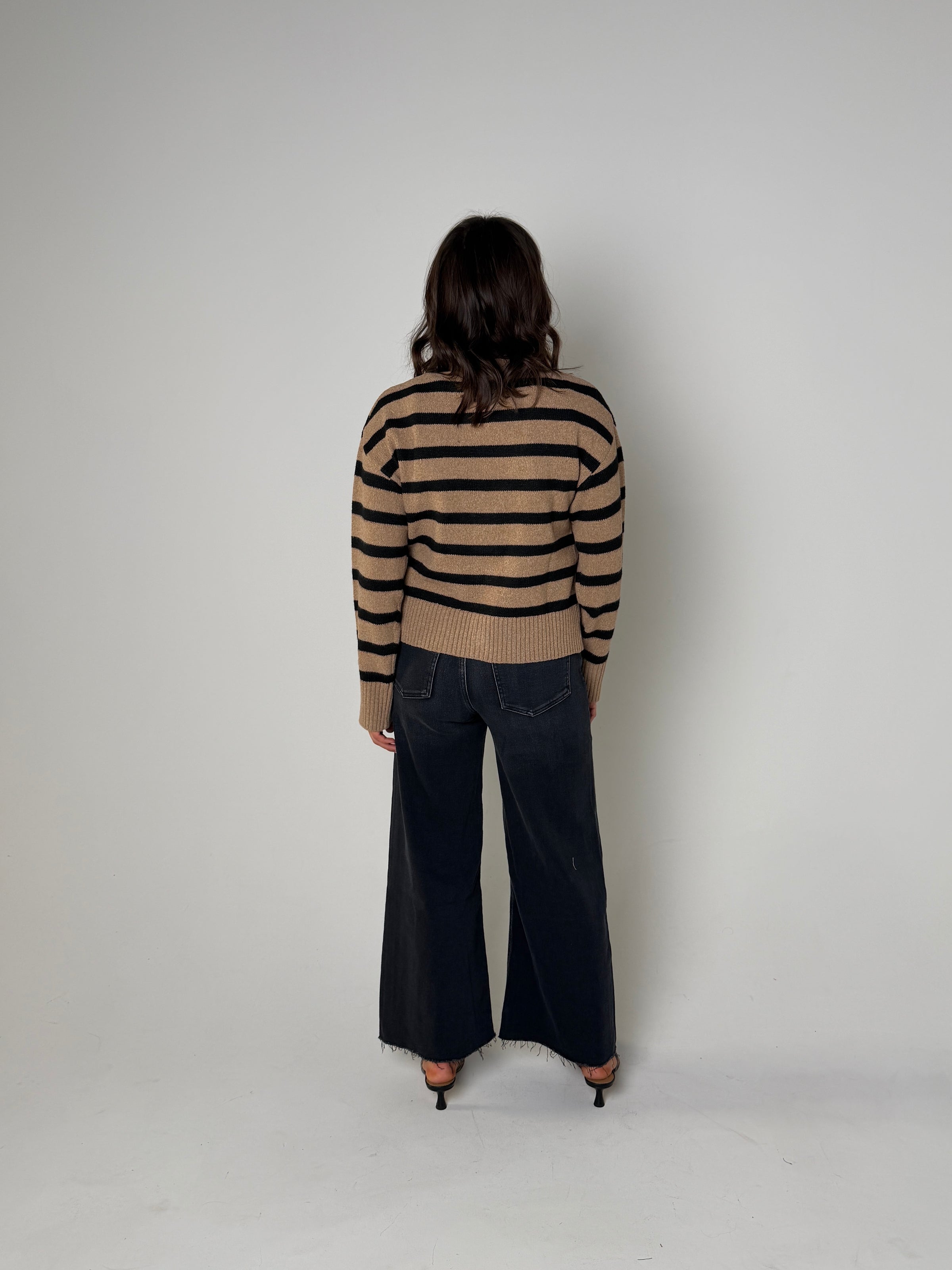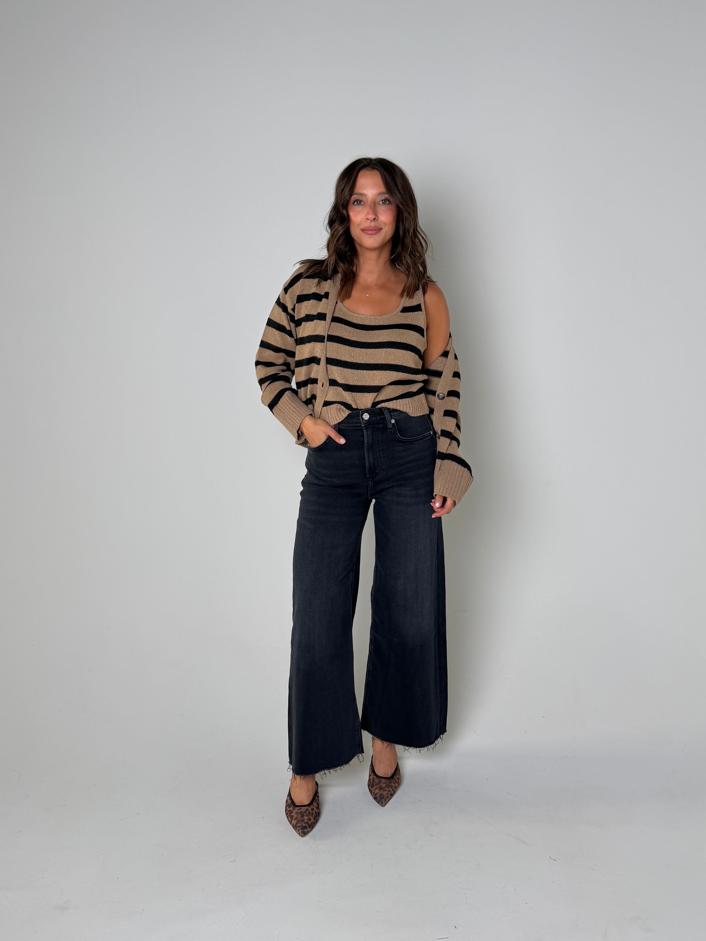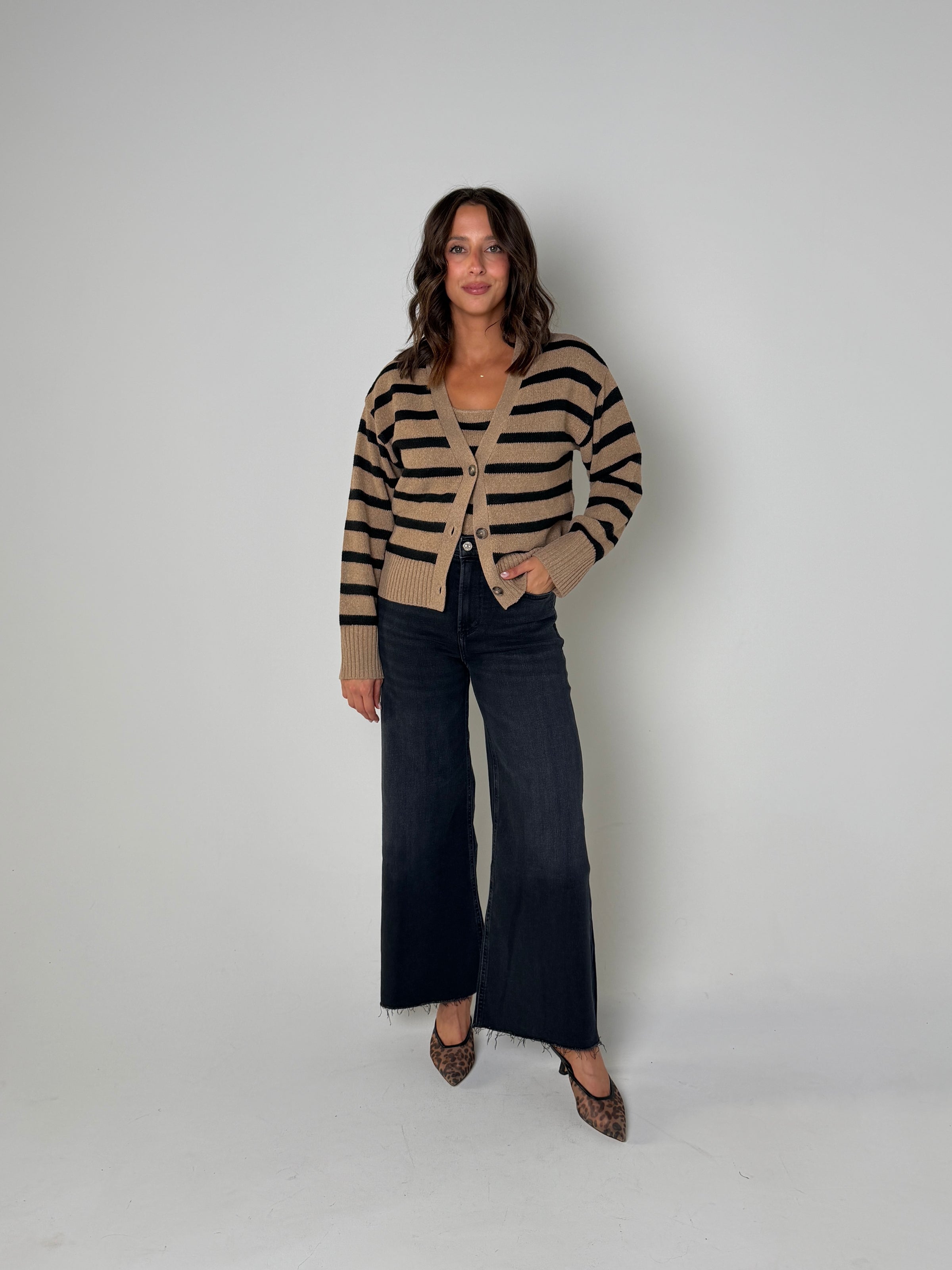 Stylist Tip: This Piper cardigan set offers both style and versatility. Made with a cafe stripe design, the set includes a cardigan and matching cami. Perfect for layering on chilly days, this set is a must-have for any fashion-forward wardrobe.