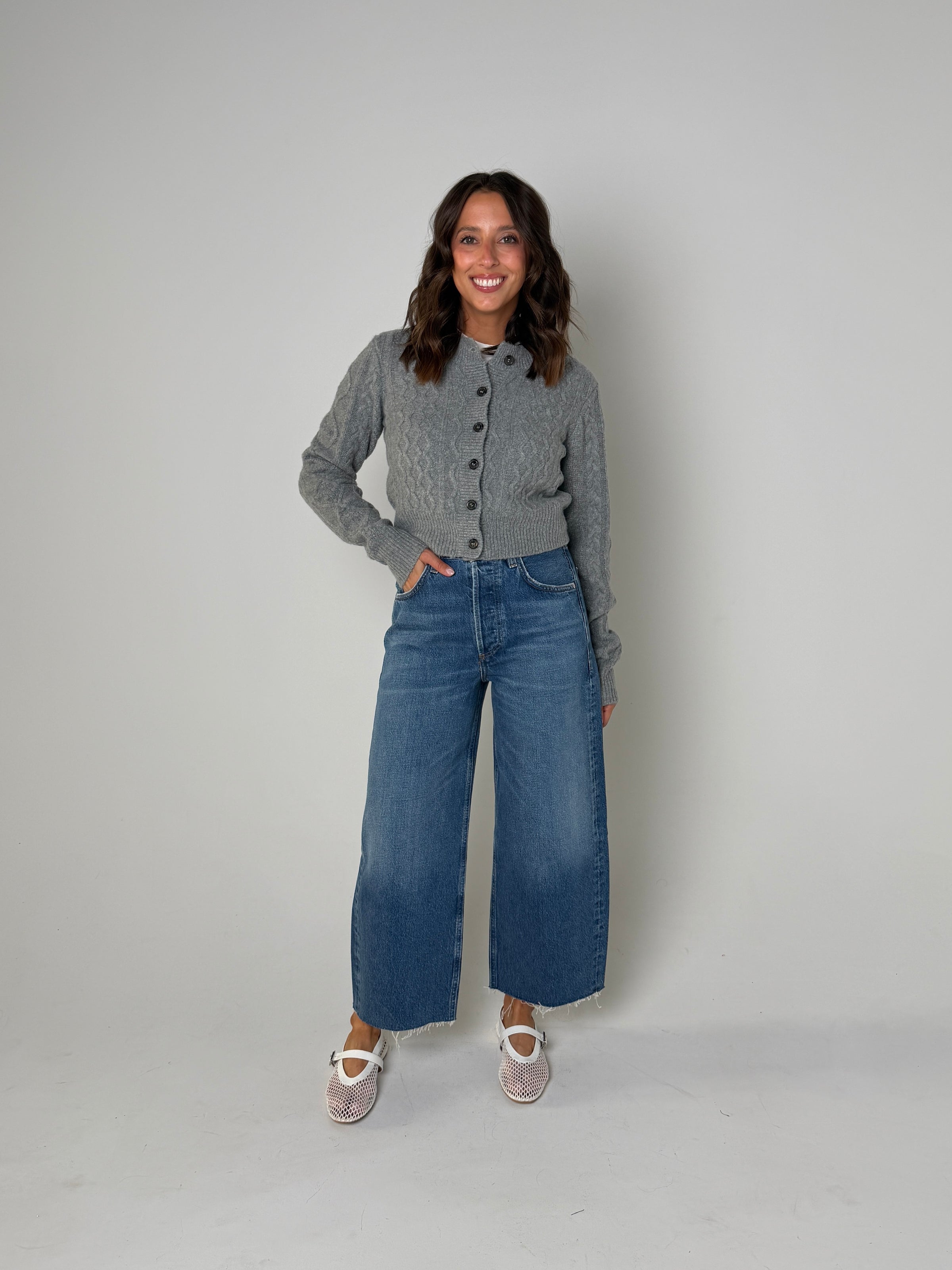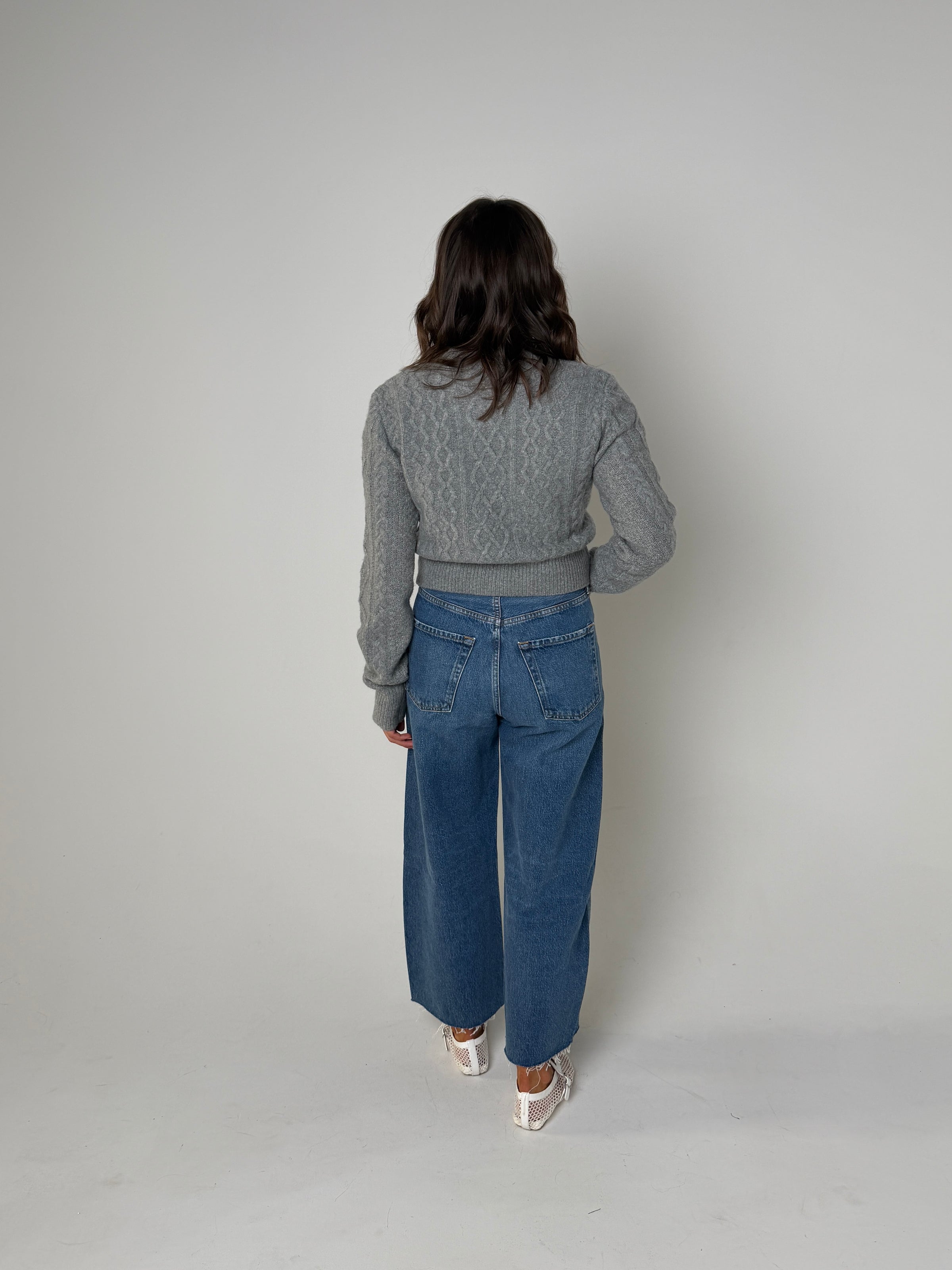 Stylist Tip: Expertly crafted for warmth and style, the Elenor Cardigan is the perfect addition to your fall wardrobe. Made from a luxurious cable knit in heather grey, this sweater is accented with dark grey buttons for a sophisticated touch. Stay cozy and chic this season with the Elenor Cardigan.